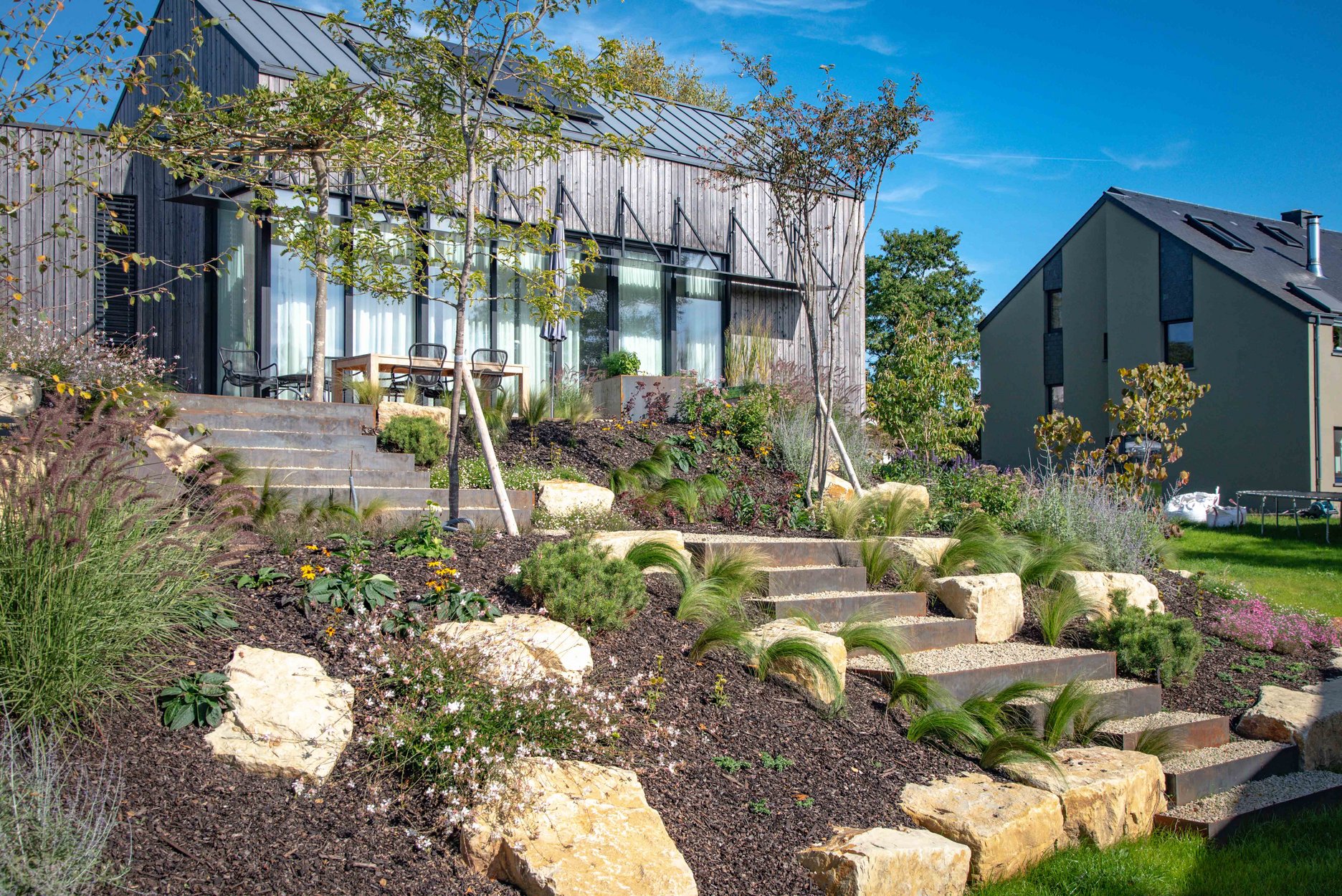Für uns ist der Bau eines Gartens mehr als nur das Bepflanzen von Pflanzen – unser Ziel ist es funktionale Außenbereiche zu schaffen. Deshalb verfügen wir über ein eigenes Team von Bauexperten, Maurern und Schreinern, die Terrassen, Gartenstrukturen für die Aufbewahrung oder für Werkzeuge, sowie Zäune, Pergolen und Sichtschutzwände bauen, um Privatsphäre und Atmosphäre zu schaffen.