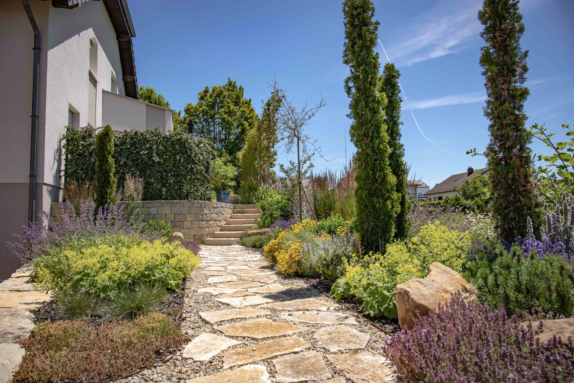 Der Vorgarten begrüßt Besucher mit der sonnigen Wärme von Sandsteinmauern und -stufen, deren goldene Töne die sanfte Leuchtkraft südlicher Landschaften widerspiegeln. Pfade aus beigen, polygonalen Steinplatten schlängeln sich anmutig durch üppige, trockenheitsresistente Pflanzen.