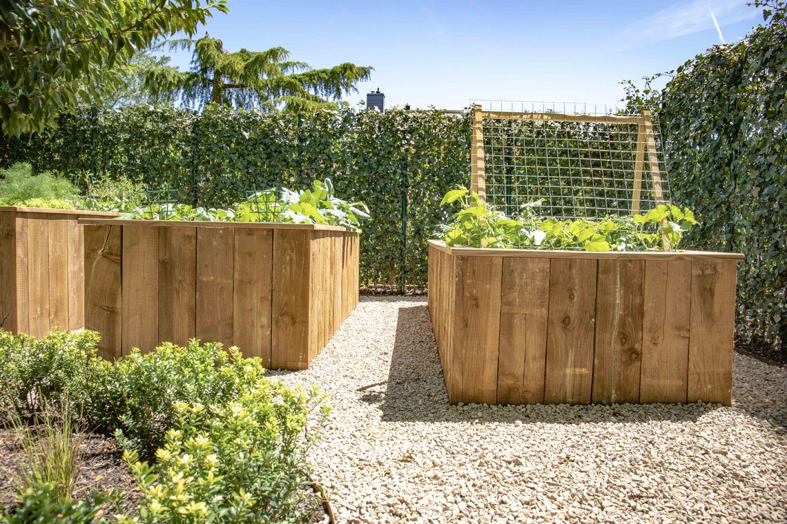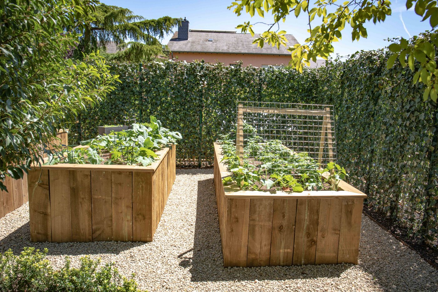Der hintere Garten nimmt einen persönlicheren Rhythmus an, ein Raum, der dem Wachstum, der Ernte und der Ruhe gewidmet ist. Drei Hochbeete aus Douglasienholz bilden das Herzstück dieser intimen Zone und bieten sowohl einen funktionalen als auch einen ästhetischen Ankerpunkt für den saisonalen Anbau. Die warmen Holztöne ergänzen das umgebende Grün und verbinden Zweckmäßigkeit und Schönheit mit spielerischer Leichtigkeit.