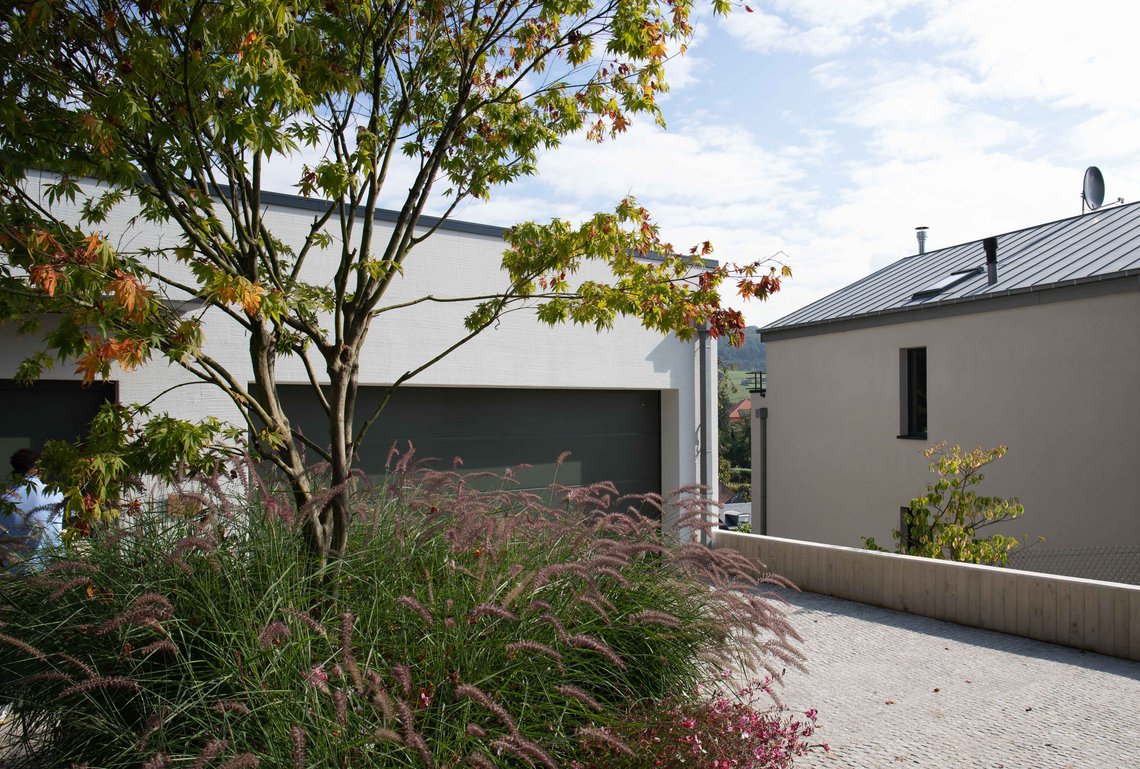 Die obere, vom Wald inspirierten, Ebene, setzt sich aus mehrstämmigen Betula jacquemontii und Ginkgo biloba zusammen, die für vertikalen Rhythmus und skulpturale Präsenz sorgen. Ein sorgfältig ausgewähltes Unterholz aus Hosta, Hakonechloa macra, Asarum europaeum und Hydrangea paniculata "Limelight" schafft einen nuancierten Kontrast von Texturen und Farben, der dem Garten Tiefe und saisonale Dynamik verleiht. Eine hölzerne Pergola mit integrierten Schaukeln gibt dem Ganzen einen subtilen industriellen Touch. Strategisch platzierte Felsen, die aus der Region stammen, dienen zur Abgrenzung des Hangs und fungieren sowohl als funktionale Anker als auch als skulpturale Orientierungspunkte, die die vielschichtige Topografie des Gartens betonen.
