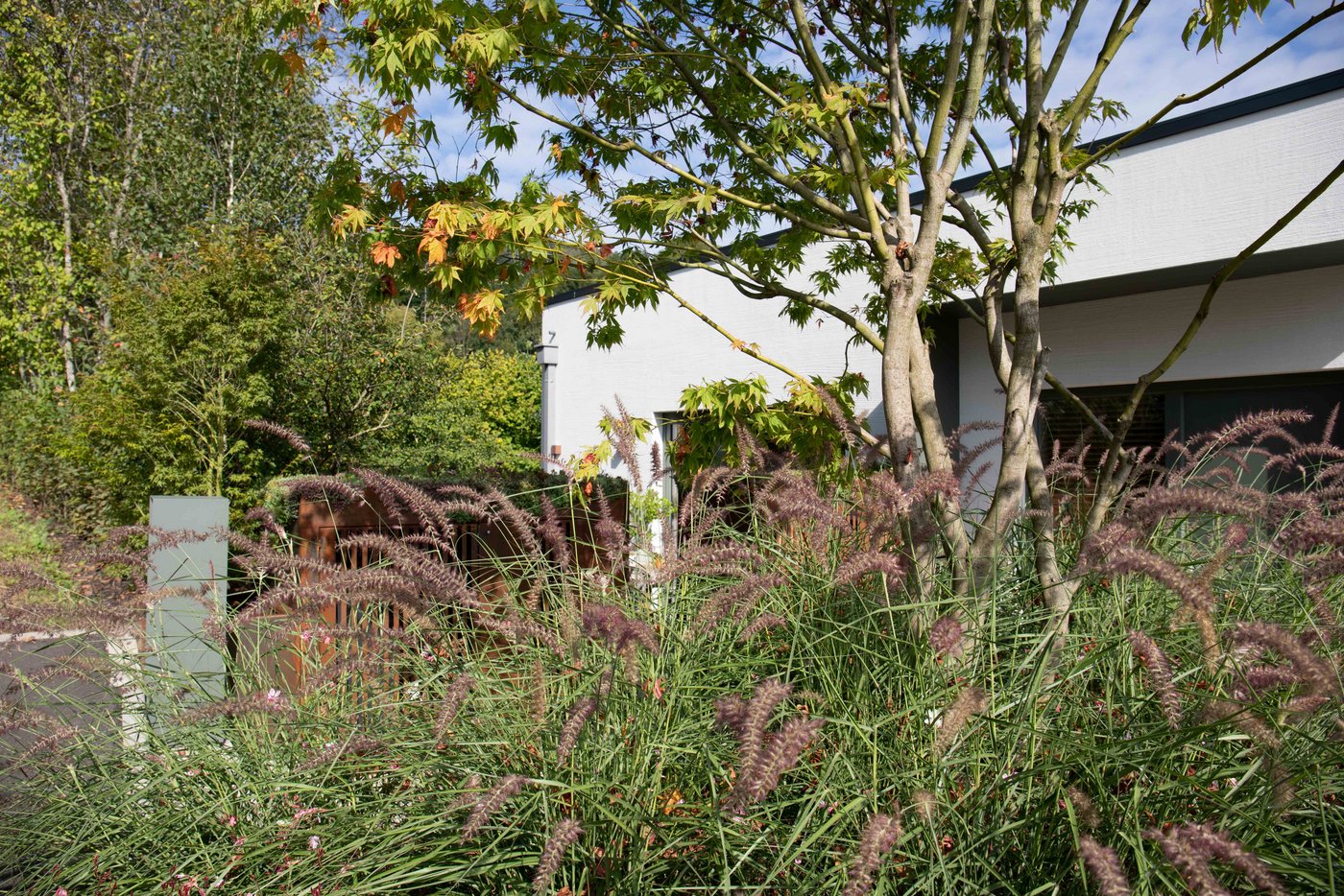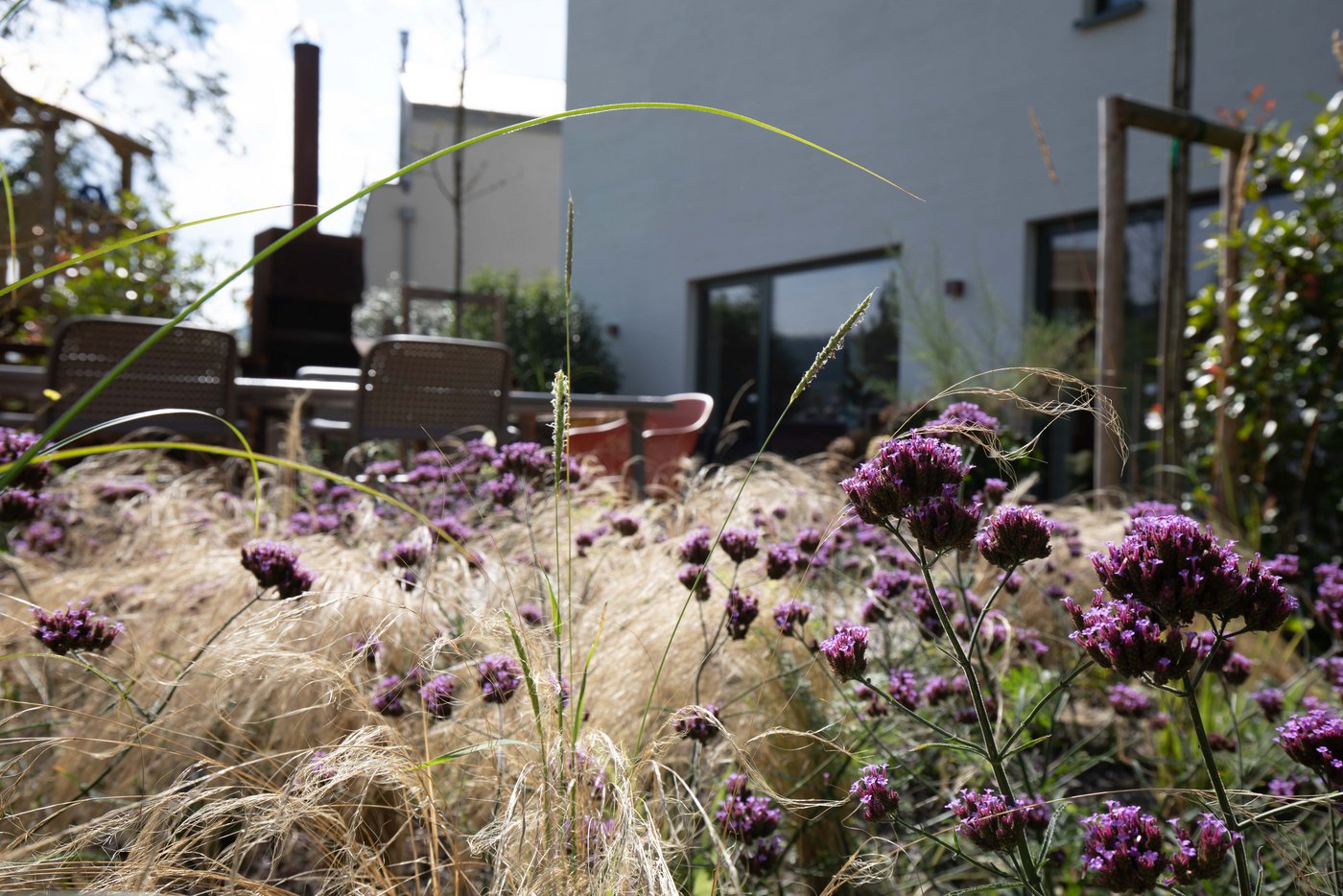 Beim Abstieg des Hangs, kommt die zentrale Terrasse zum Vorschein: ein großer Außenraum, der sich harmonisch mit den unteren Ebenen verbindet. Der Raum ist von Ziergräsern (Calamagrostis, Stipa, Verbena) umgeben, die für Weichheit und Bewegung sorgen und gleichzeitig den Blick auf die verschiedenen Ebenen des Gartens lenken.